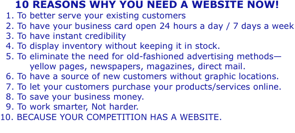 ![]() Whether you sell a product or provide a service, it is essential for your business to have a Web site. Your customers are already using the internet to shop for goods and services, and if they aren't finding you online, you are losing business to your competitors every day. |